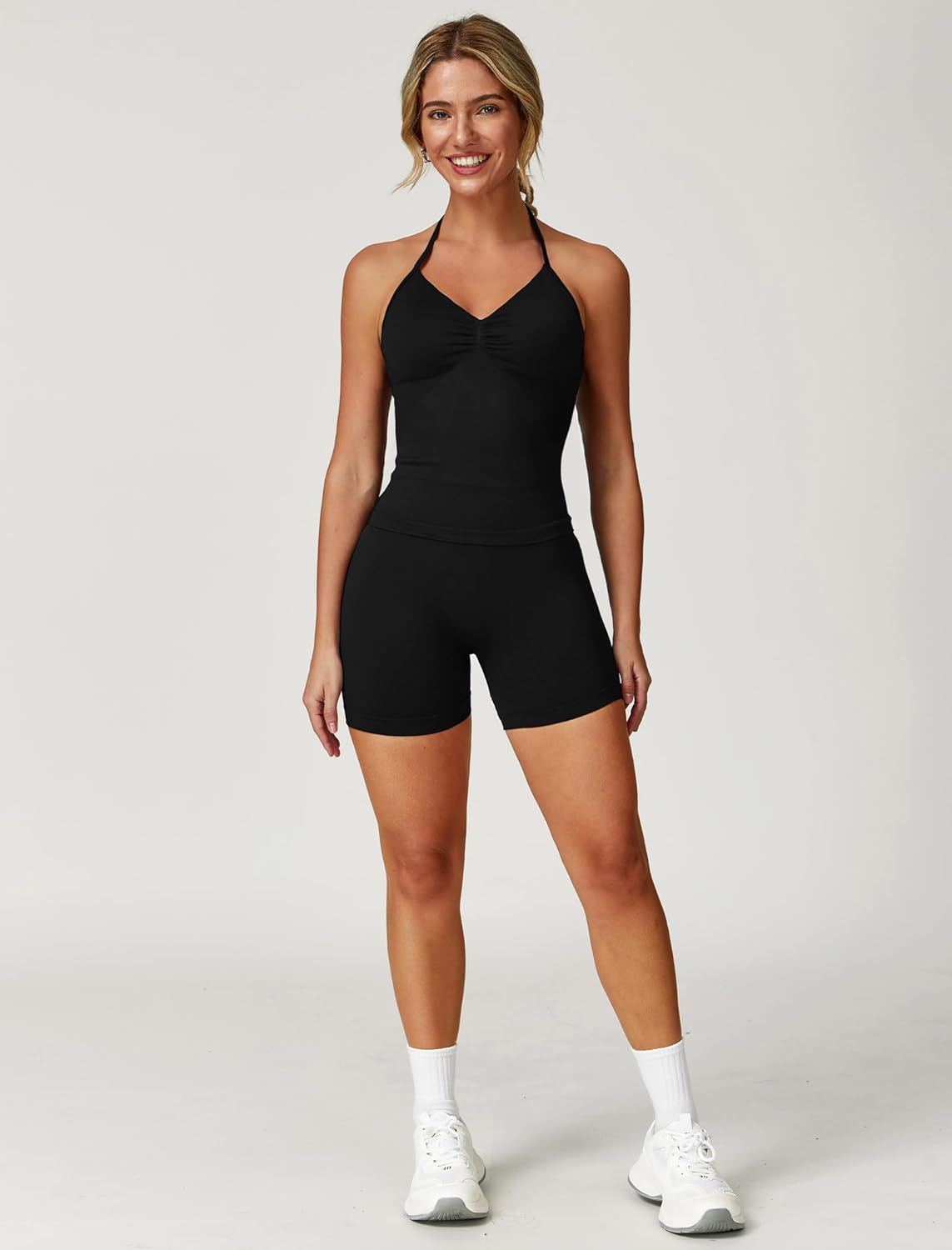 ABOCIW Workout Sets for Women 2 Piece Seamless Impact Longline Strappy Top Halter Sports Bra Scrunch Butt Lifting High Waist Biker Shorts Gym Set Work Out Clothes Black Small