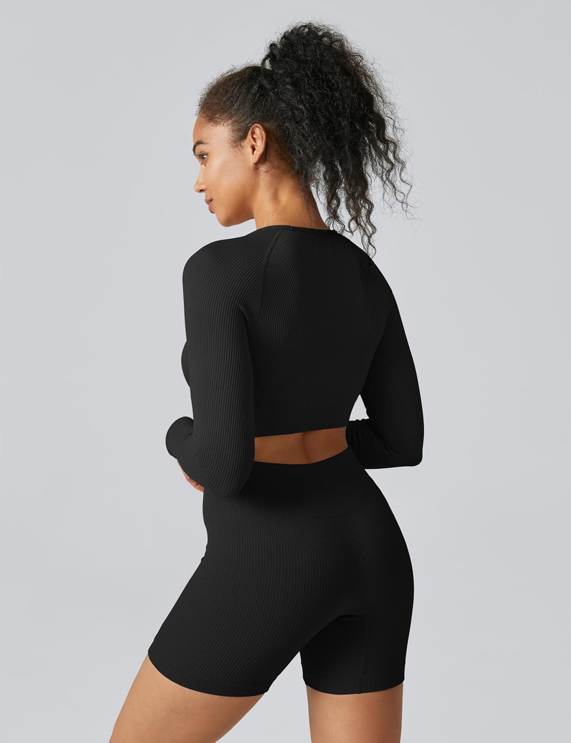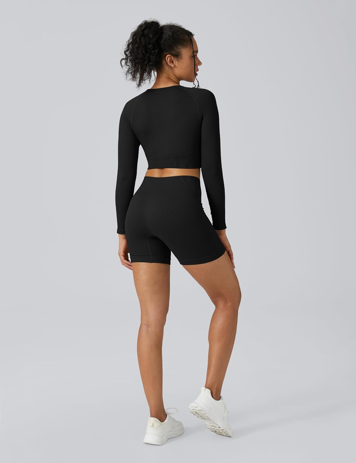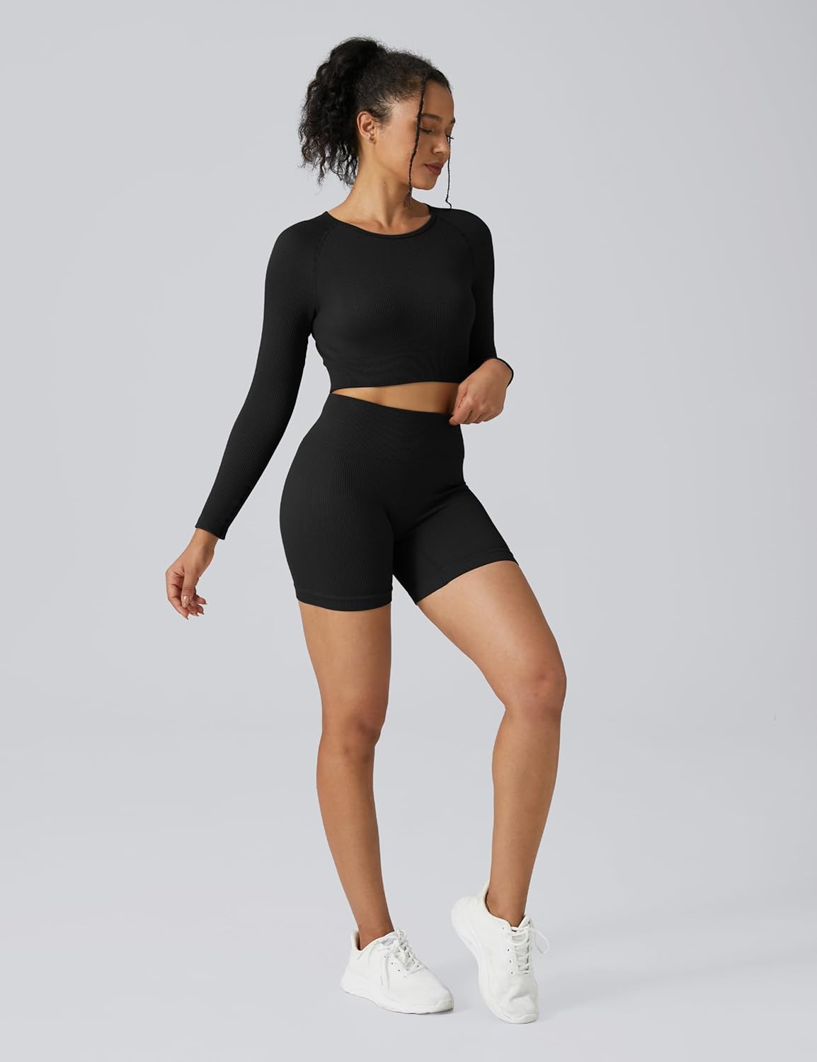 Buttergene Women Workout Sets 2 Pieces Long Sleeve Yoga Outfits Gym Clothes Seamless Ribbed Crop Top High Waist Leggings quantity