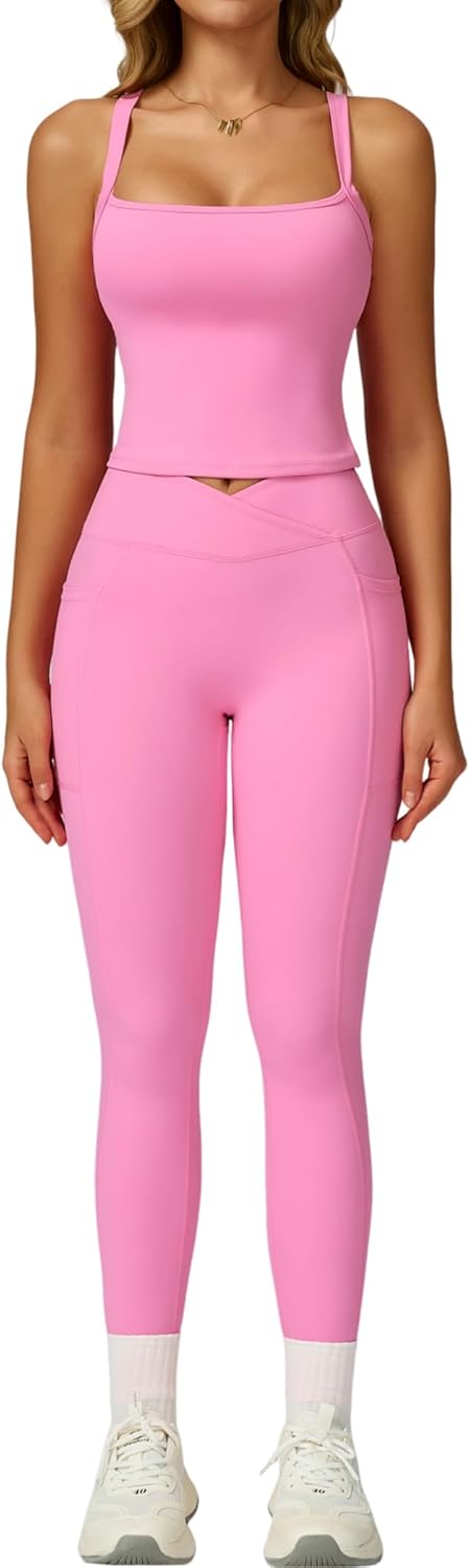 QBGJTD Womens Workout Sets Two Piece Spaghetti Straps Tank Top Matching High Waist Leggings Gym Work Out Outfits with Pockets quantity