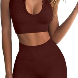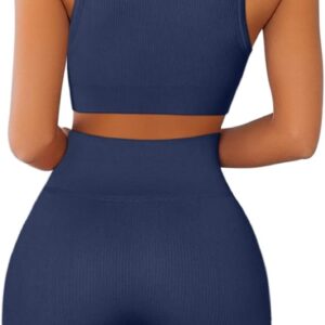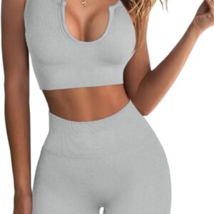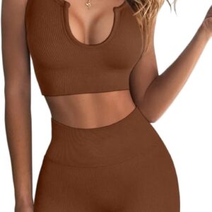 QINSEN Workout Outfits for Women 2 Piece Ribbed Seamless Crop Tank High Waist Yoga Leggings Sets